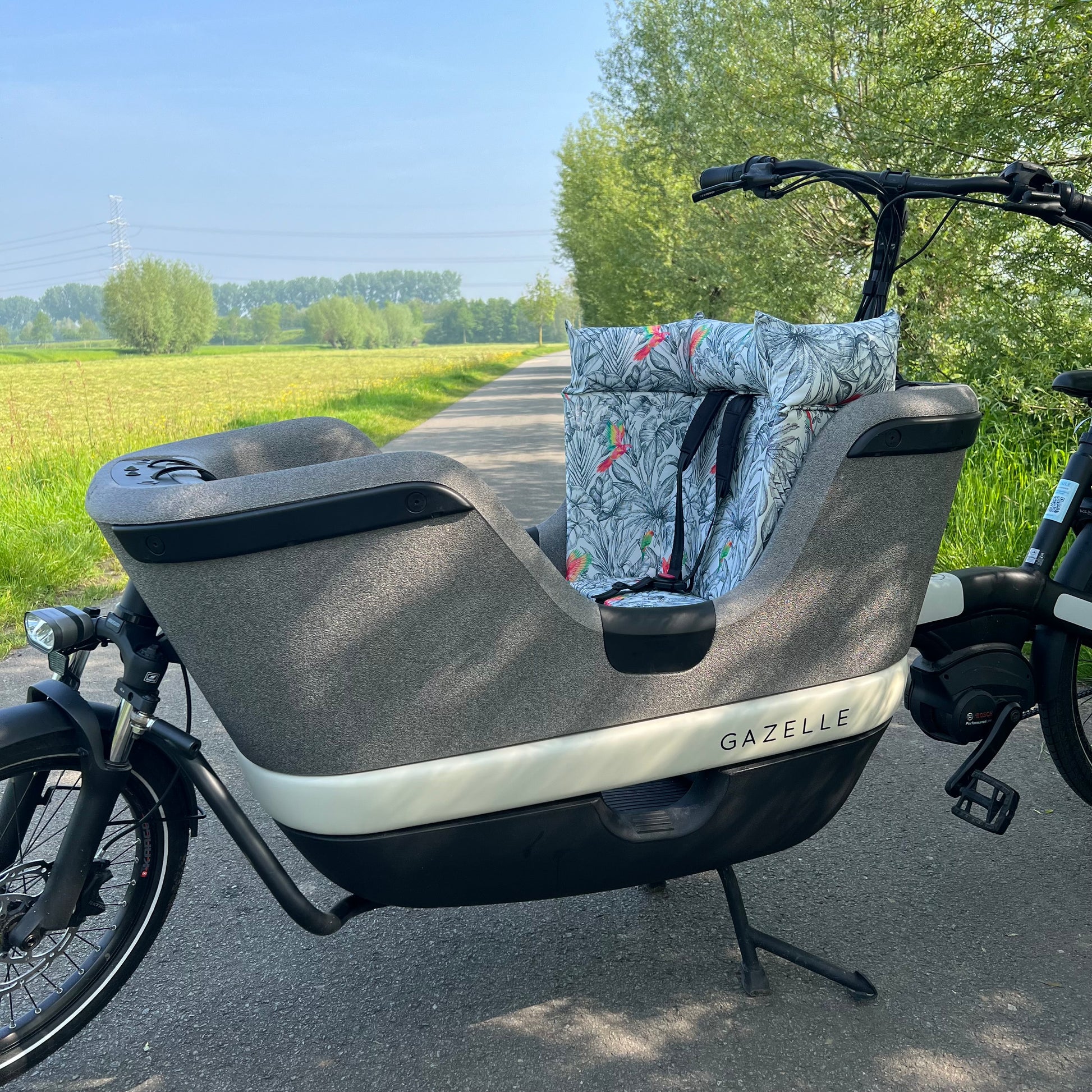 Whether you're cycling to school or heading out on a long ride – this comfortable seat cushion makes every trip in the Gazelle Makki cargo bike more enjoyable. The cushion provides extra support for the back and neck. This helps your child sit more comfortably and securely – even if they fall asleep along the way, the cushion keeps them well supported.