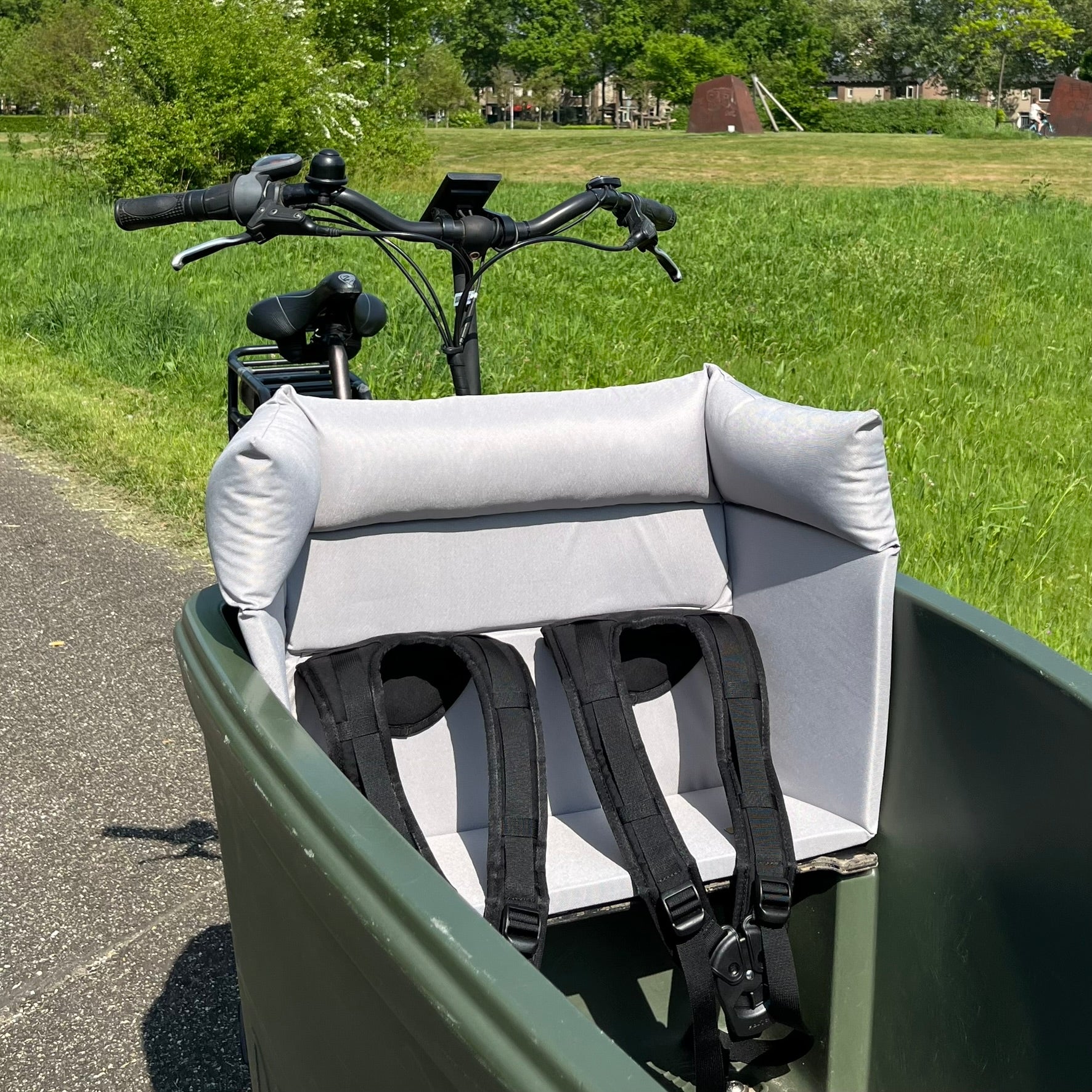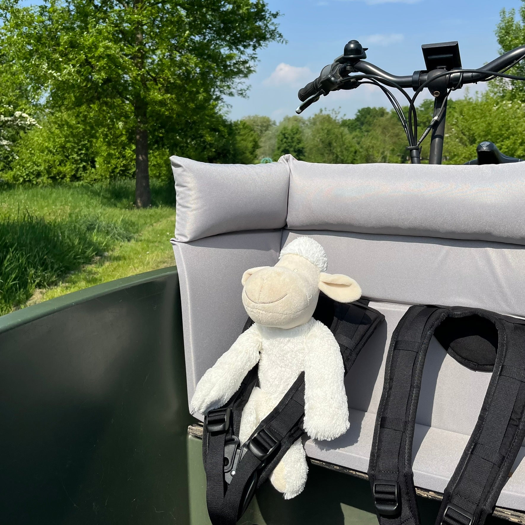 Das Kissen ist mit allen Dolly-Lastenrädern kompatibel – egal ob mit neuem oder älterem Gurtsystem. Es wird in den Niederlanden hergestellt.
