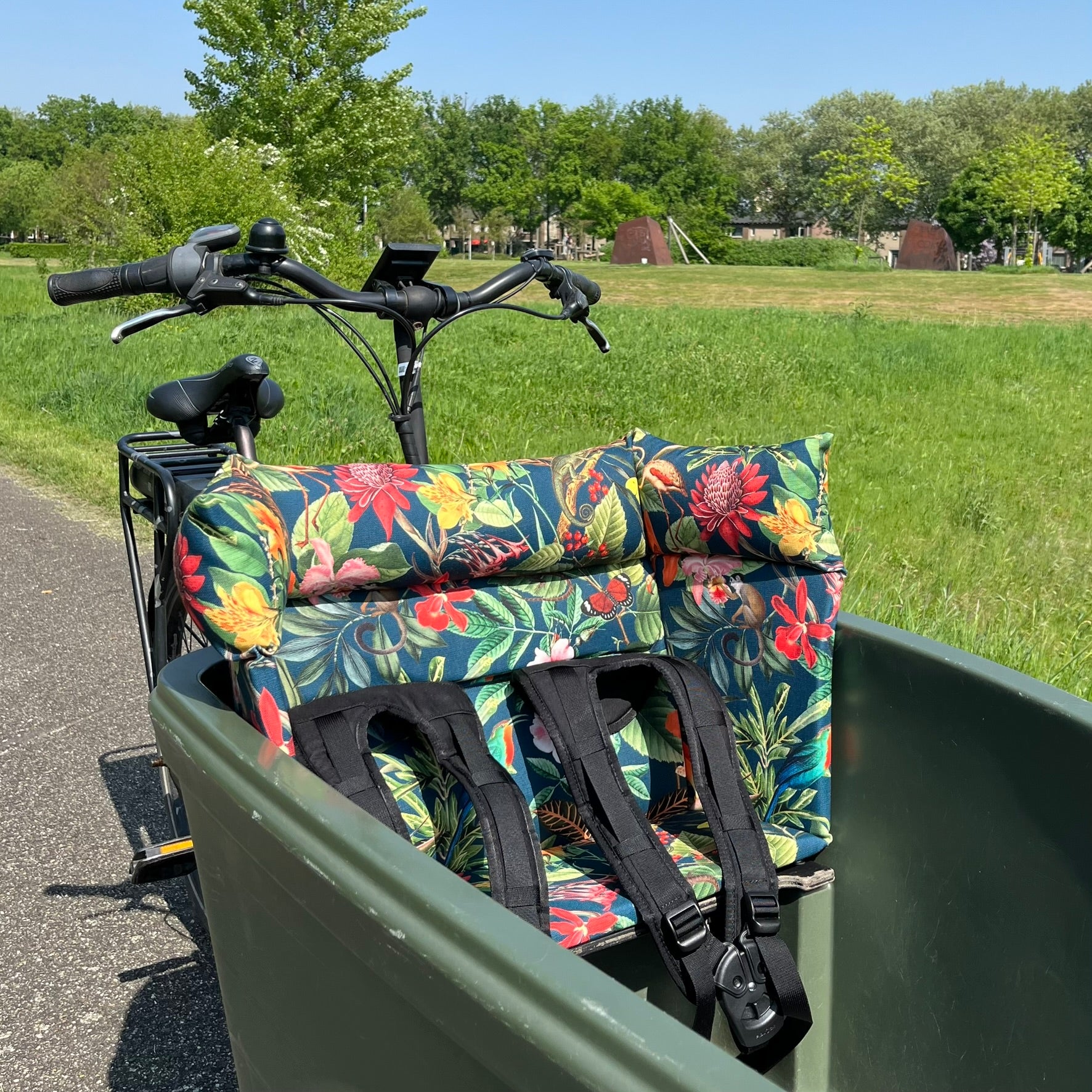Das Kissen ist mit allen Dolly-Lastenrädern kompatibel – egal ob mit neuem oder älterem Gurtsystem. Es wird in den Niederlanden hergestellt.