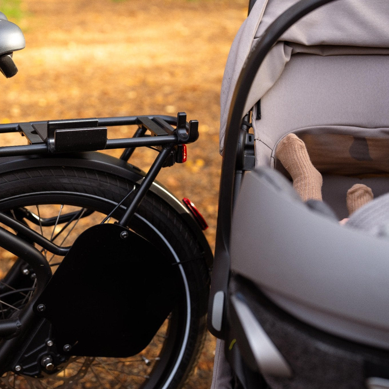 Die BuggyFix besteht aus einer pulverbeschichteten Stahlplatte in Kombination mit zwei PETG-Halterungen. Durch die Positionierung an der Rückseite des Lastenrads bleibt deine Tretbewegung vollständig frei.